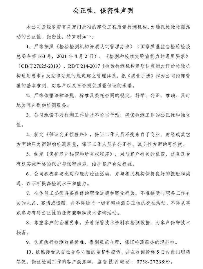 公司自成立以來始終秉承“源于真,立于正”的價值觀,堅持“服務(wù)真誠優(yōu)質(zhì),檢測公正科學(xué)”的質(zhì)量方針,全力打造“真正快高”(數(shù)據(jù)真,結(jié)果正,響應(yīng)快,價值高)的核心能力,堅守“以專業(yè)高效的檢測監(jiān)測服務(wù),為建設(shè)工程高質(zhì)量發(fā)展賦能,為美好生活保駕護(hù)航,實(shí)現(xiàn)員工、企業(yè)和社會共同發(fā)展”的使命,致力成為一流的、具有崇高公信力的檢測與監(jiān)測技術(shù)服務(wù)企業(yè)。